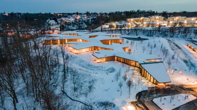 The proof is a 51,563-square-foot, single-level mixed-use structure (office and manufacturing) that flows down a gentle series of sculpted swales for more than half a mile. The dendritic shape commands immediate attention, a study in fractal geometry shaped by the site’s natural conditions. Do you like corners? This building features more than 70, both inside and out.