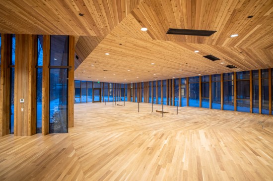 The sharp-angled configuration only hints at the teamwork required to achieve it. Thousands of uniquely cut and milled wood components were fabricated and painstakingly assembled, from small intricately CNC-carved pieces to 83-foot-long timbers weighing over 17,000 pounds.