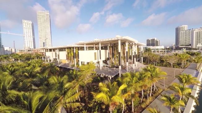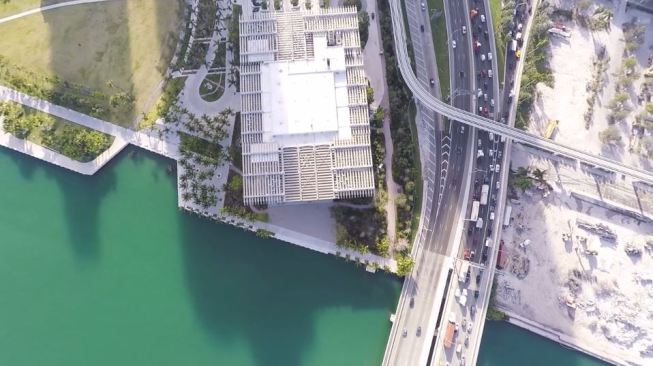 Hill explains that the team used drones for the aerial shots, as well as time-lapse photographs and video. The film also includes interviews with PAMM’s chief curator Tobias Ostrander and architect Terence Riley, AIA, the former director of the Miami Art Museum (renamed after Jorge M. Pérez when it moved to its present location).