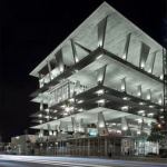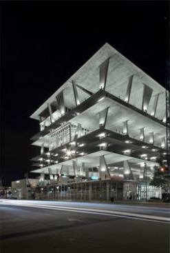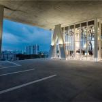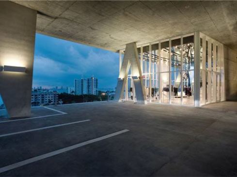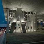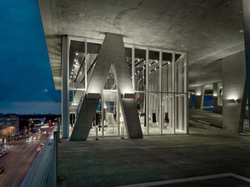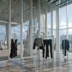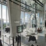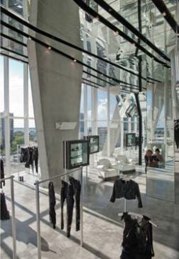 Twenty-two-foot-high glass panels, a kinetic mirror installation, and a reflective interior ceiling make this clothing store—located on the fifth floor of a parking garage designed by Herzog & de Meuron—seem to hover. Pedestrians have clear views into the boutique, which is perched on the edge of the floor plate and visible from the street below, helping to draw curious clientele up to the store and to the merchandise they see reflected above.