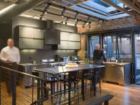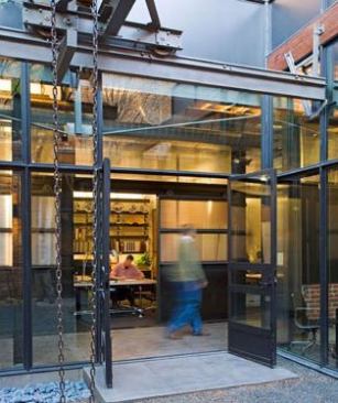 The client’s goal was to respect this building’s colorful past—it was originally a brothel, and later a machine shop—and salvage as much of the industrial structure as possible while modernizing the interior for a local Denver business. Raw materials were preserved and new circulation routes—including two cantilevered, folded steel-plate staircases and a catwalk—were added. An interior courtyard brings light into an otherwise dark space.