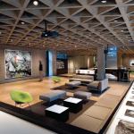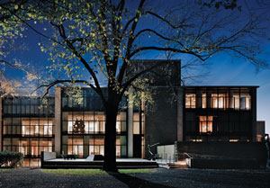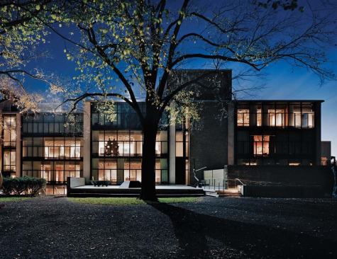 At one end of the lobby, geometric canvases by Josef Albers and Sol LeWitt offer a visual counterpoint to Kahn’s ceiling. At the other end, contemporary sofas, retro Bertoia chairs, and cubic tables gather beside a black cabinet—a student “media lounge” designed by New York architect Joel Sanders.