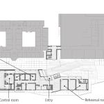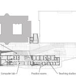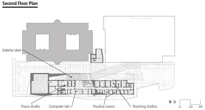 The 37,000-square-foot addition is three stories tall, plus a basement, and houses the jazz studies department. Other facilities include a recording studio, rehearsal and performance spaces, teaching studios, practice rooms, and archives. The building’s program is stacked in a way that makes sensible use of the material mass necessary to acoustically isolate each of these spaces. The ground floor has percussion practice rooms and rehearsal studios that require the densest construction. Standard practice rooms, needing slightly less dense construction, are on the second floor, and offices—the closest the Kohl Building gets to conventional construction—are on the third floor.