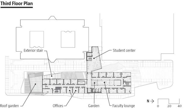 The architects planned the building to create a north-south axis. Accessed from Tappan Square to the north, students proceed through a plaza between the old and new structures, and an exterior stair moves up the Kohl building façade and terminates the axis in another green space: a third-story roof garden. “We wanted to redirect the energy,” project designer Jonathan C. Kurtz says. “It’s a dense, urban landscape—where the rest of the campus is more bucolic.” David H. Stull, dean of the conservatory, notes that the addition’s location behind the Yamasaki complex “isn’t where you’d [choose to] put it—it doesn’t have any street frontage.”