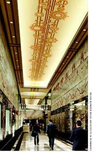 As part of the restoration, an original ceiling mural in gold and aluminum leaf depicting a linear constellation of abstract, machine-age starbursts would be revealed and rebuilt after stripping away 1960s fluorescent lighting panels. “Ceilings were an integral part of many Art Deco buildings’ personality,” says BBB partner in charge Richard Metsky. “They set the mood, theme, and setting for office tenants and guests.” New ceiling cove lights using energy-efficient, cold-cathode technology would recall the lobby’s original incandescents in illuminating the mural and providing ambient light. In addition, carefully placed spotlights would shine straight down, eliminating the glare that currently mars the walls. BBB is also studying ways to improve reception, signage, and security in conjunction with overall renovations being made by building owner Empire State Building Associates.