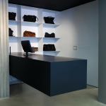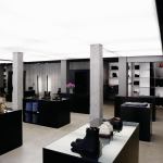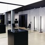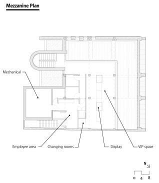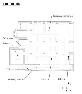To get to the structure’s real attitude, the architects stripped away four decades worth of renovations, revealing a rough-hewn concrete mezzanine tucked inside a brick shell. They updated the interior with a series of smoked glass and mirrored walls that seem to expand the space into impossible dimensions. Black metal display fixtures reference the minimalists of the art world. Shirts and pants hang from Sol LeWitt–style grids—square black steel sections suspended from the ceiling and outfitted with built-in fluorescent lighting. The concrete mezzanine is put to use as a more intimate VIP shopping area, with additional clothing and accessories on display. Tucked underneath in the main boutique and lit by a fabric luminous ceiling, leather boots sit on Donald Judd–like cubes. Equal parts arty and edgy, a cantilevered cash wrap skinned in black rubber emerges from a wall of white shelves.