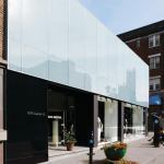 Driving up Laurier Ouest, architect Gilles Saucier spies Michel Brisson, a 3,700-square-foot menswear boutique designed by his firm Saucier + Perrotte Architectes, out of the car windshield and gasps. “The façade today is green,” he says excitedly. Much to his delight, the storefront’s gray glass curtainwall reflects an image of the nearby foliage. The modern storefront, as tailored as a bespoke flannel suit, is wearing a seasonal print.