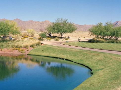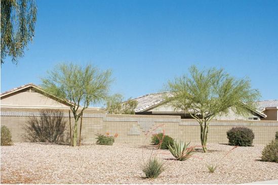 It all seems unlikely. But as you cruise a few miles up the parkway from the interstate into the scrubland, an oasis of sprinkler-fed green lawns appears on the left. It is Tartesso West, a 5,500-acre master planned community where home builders such as Hacienda, Atreus, Pulte, and Canterra are erecting the first dozens of 21,790 planned housing units around a series of neighborhood parks. They are mostly attractive, single-family stuccoish houses with multiple gables and xeriscaped front yards, sunning under high-voltage lines drawn from the Palo Verde Nuclear Generating Station off to the southwest. A sign near the entrance advertised houses starting from $199,999.