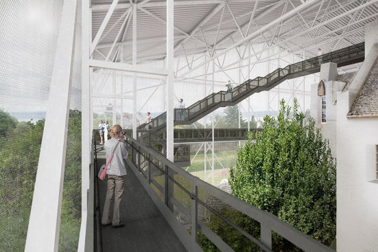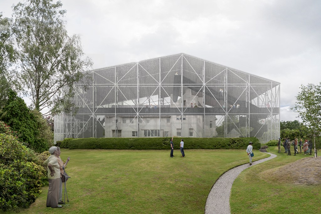 Carmody Groarke’s design would cover the historic mansion with a semi-transparent enclosure made of perforated mesh. The outer shell will protect the house from wind, rain, and humidity but still allow air to circulate, which will help the building to dry faster. Inside, elevated walkways and viewing points allow visitors to watch the restoration work in progress and have a closer look at Mackintosh’s design.