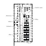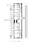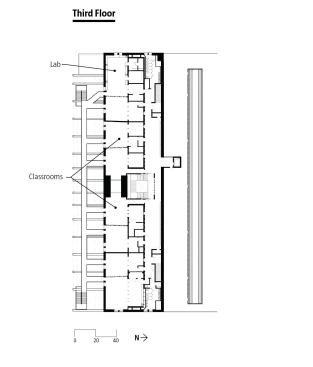 From the hall, doorways cut through the original thick brick dividing wall and into the classroom wing, once home to the plant’s massive boilers. What was once a 75-foot-high space laced with catwalks and open metalwork stairs has been subdivided into three floors to accommodate lab spaces and classrooms. These rooms still show signs of the building’s original purpose—one has a preserved section of conveyor, and others, the trapezoidal bases of the coal hoppers. “Every space has a different morphology and different historic elements,” Boyer notes. “That uniqueness is what gets you interested in the space.”