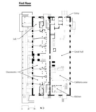 When the building opened three years later, in time for the 2009 school year, all signs of the epic design and demolition process had been erased. Today, students enter into the restored great hall, which still retains its glazed brick and much of the original floor tile. Anything too damaged to be retained was replaced with in-kind materials. The space is now used for assemblies and as a cafeteria; a mezzanine houses a teachers lounge.