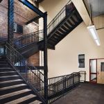 The biggest structural move in the project was one that no one foresaw. The fire department decided mid-build that the slope of the access road was too steep for fire engines to navigate (cutting off code-required access), so the architects devised a massive system of steel catwalks and stairs on the building’s south side, hung off of the original structural frame and accessible from every classroom. The system doubles as a shading device.