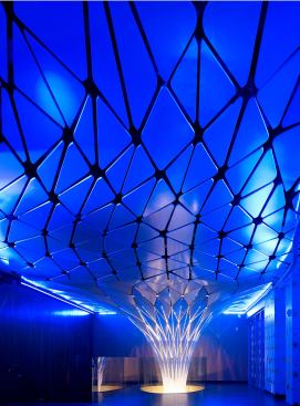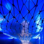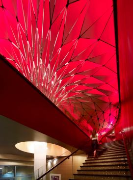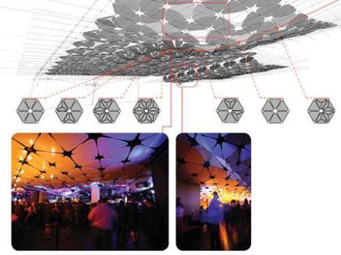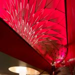 Located near Los Angeles’ Staples Center, the Conga Room is a Latin-inspired interior with a functional and malleable layout for live entertainment, dancing, and events. Petal-shaped acoustic tiles can be angled to modulate sound and reflect the heavy bass and pitch of rumba and salsa music, and a computerized LED system can be synchronized with the beat.