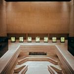 Unadorned travertine walls on the east and west provide a monolithic appearance for the museum.