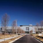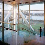 Extensive glazing allows daylight to reach interior spaces, while providing views toward the Arkansas River and the surrounding park.