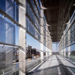 A solar screen reduces interior solar gain, while temperatures are mitigated by demand-controlled ventilation and radiant floors.