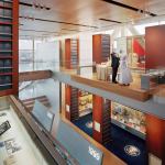 Gordon Bunshaft of Skidmore, Owings & Merrill oversaw the LBJ Presidential Library, in Austin, Texas—the most-visited library of the National Archives collection—which is an unadorned 10-story travertine monolith on UT Austin’s campus that features a 7/8-scale recreation of Johnson’s Oval Office. The library’s Great Hall boasts a ceremonial staircase and views into four floors of its eight-level archive, which contains 5000 hours of recordings from Johnson’s tenure as president; an animatronic version of President Johnson greets visitors at the library entrance.