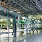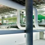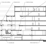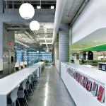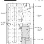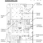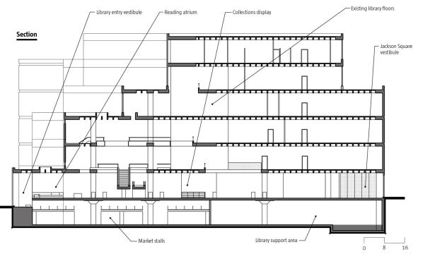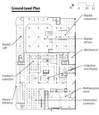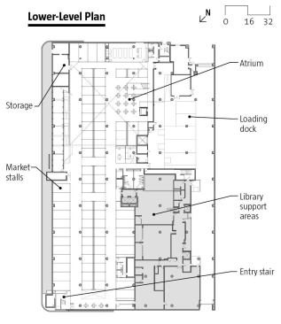 The ground floor of the public library floats above the market and is separated by a glass partition, which is a fire-rated partition that blocks market noise while allowing views to the street and cityscape beyond. “The resulting open space elevates the people and the material in all sectors; they provide the color in the program like in an art gallery or a museum,” says chief librarian Ken Roberts.