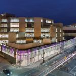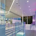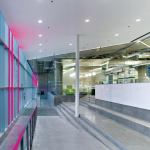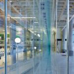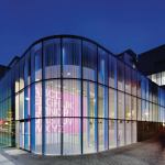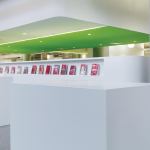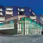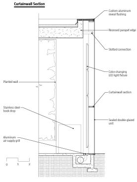 The new glass façade—an energy-efficient double-glazed envelope that stretches the length of a city block—reflects the overarching aim of combining two typologies and inner and outer urban spheres in a single contemporary building. At street level, the low-iron, ultra-clear glass zeroes out so that the interior floor meets the exterior sidewalk in seamless transition. Color-changing LED fixtures programmed with a predetermined display pattern are integrated into the curtainwall system; the light moves in a slow pulse that mimics the indicator light on a sleeping MacBook. While the farmers market is rife with the colors of food, flowers, and shoppers, the ground floor of the library is alive with technophiles, and the films and artworks projected onto three holographic-filmed glass walls are visible from outside at night. The overall effect “feels like walking through an iPod Touch. It reflects the Apple lifestyle,” says Roberts.