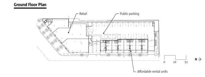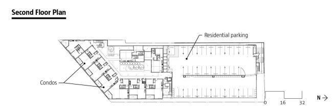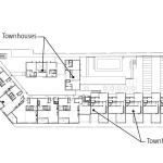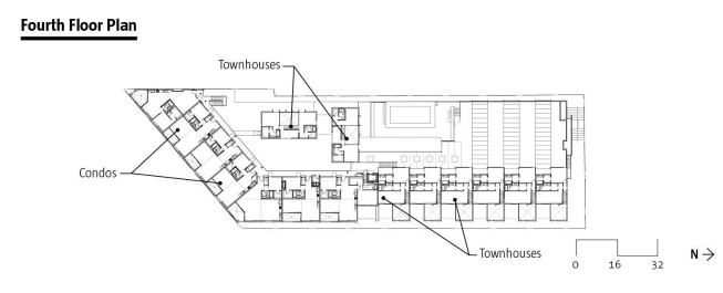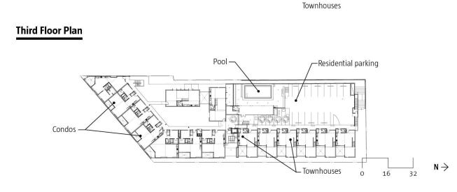 A level of resident parking separates the rental units from the market-rate condos. It’s masked by a screen of vertical Mangaris wood slats—which neatly double as balustrades on the townhouses—but it is still there, the project’s leitmotif. The parking ramps spiral up from the public parking to the second story, where glass doors open onto a verdant outdoor podium. Here, the front doors to the loft units wrap the courtyard on two sides.