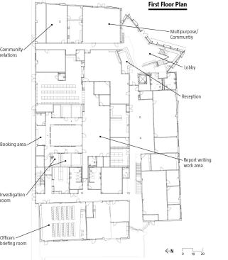 Also important was how the building worked for the officers. Wide hallways make it easier to maneuver with heavy equipment, and recycled rubber floors ease the impact of a long day of standing.