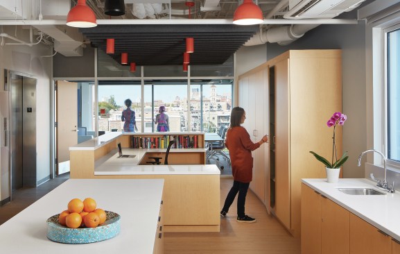 At ground level, patrons are greeted by an environment more akin to a local cafĂ© than a healthcare facility, a move resulting from trauma-informed design principals that consider the “bad associations with institutions [common among LGBTQ youth],” Luken recalls. “We attempted to reduce the threshold of entry.”