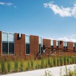An intensive green roof with a mixture of sedum and native prairie grasses planted in 6 inches of soil covers more than 30 percent of the roof area. The remaining surface is a built-up roof that drains through the three large reclaimed woodclad scuppers, which divert rainwater into a trio of above-ground cylinders fashioned out of 1/2 inch-thick rolled Cor-Ten steel. Each of the drums is 24 feet in diameter, and filled nearly to capacity with taconite rock.
