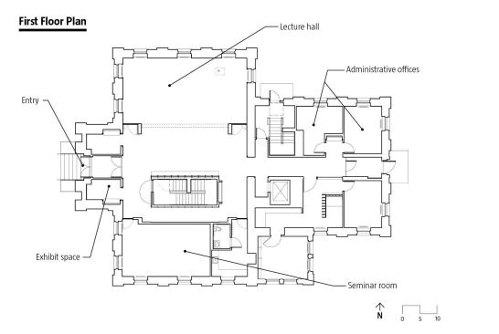 It was the rare interiors commission with a strong mission, a distinguished existing building, and a mandate to build inside from the ground up. The program itself called for classrooms, a lecture hall that could double as an event space, and faculty and administrative offices. “They wanted niches for artifact display,” notes Winton, “but they were clear about being perceived as an active research facility, not a museum.” The architects organized the program so that the most appropriate spaces would occupy the luminous second floor. Conceptually, the vector of the design went from the high-ceilinged ground floor up through a core staircase to the light.