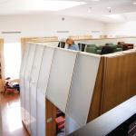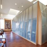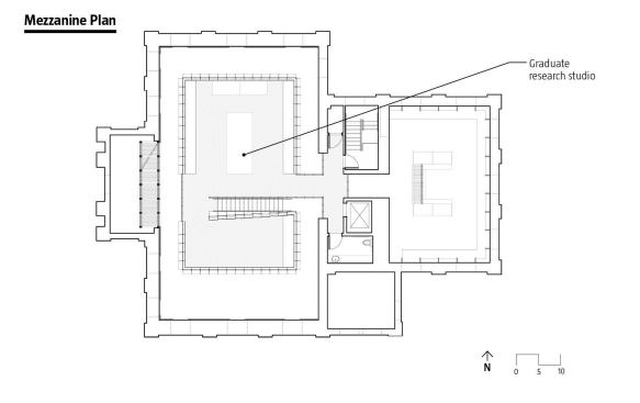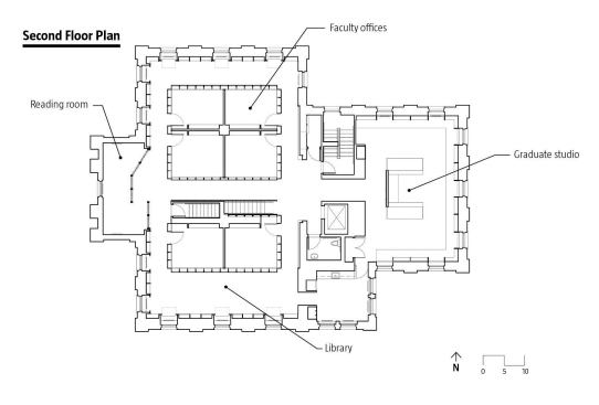 Winton and Anmahian, working with project manager Aaron Bruckerhoff, deployed the administrative offices, common room, and lecture hall on the ground floor, and set the new ceiling at a generous 12 feet. The architects saved the second floor for the faculty offices, library, lounge, and student research space. The library rings the perimeter of this double-height space, and the offices—in a translucent glass enclosure—form a glass-walled island centered in the large room. The cluster of offices acts as a podium for a mezzanine designed as an open graduate student research studio directly under the skylights.