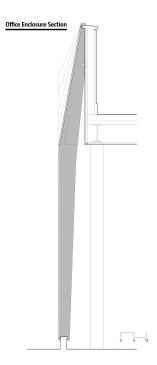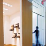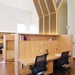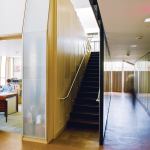 The architects orchestrated the basic rudiments of architecture—a core staircase, overlooks, pooled space, glass walls—to socialize the interior and keep it from becoming a den of isolated and isolating cubicles and offices. But there is a material corollary to their socializing strategy. Throughout both floors, the architects built screens made of slender, 1-by-6-inch, walnut-veneered fins that separate spaces without closing them. Their porosity allows spatial flow and visual access while giving the spaces definition.