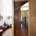 The twist, however, is in their twist. At strategic moments in the plan, the screens warp, creating peeling planes that dynamize walls and spaces within the static confines of the original stone shell. Designed and fabricated with digital files, the screens are geometrically complex, but were not difficult or prohibitively expensive to craft.