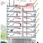 Both the silver and platinum buildings will use solar orientation and mixed-mode ventilation systems, combined with a carefully configured building envelope. “We sat down with [founder Dirk Denison] to see what would make the envelope as efficient as possible,” says Chris Taylor, an associate principal at Arup. “When the envelope is efficient, you don’t need as much HVAC.” In the summer, warm air will be moved out through a network of ventilation shafts and solar chimneys culminating in rooftop greenhouses. “We determined that [with this system] we can do 70 percent [of cooling] without air conditioning in the summer,” says Denison. In the winter, air will be solar-heated in the greenhouses to supplement traditional heating systems. The buildings will also harvest rainwater, which will irrigate green roofs on common areas and additional landscaping.