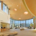 The main reception space serves as a bridge between the campus and San Rafael, the seat of Marin County. Entrances are set into glass walls on either end of the space. Clerestory windows and porthole skylights-in a ceiling clad with Ceilings Plus metal perforated tiles in a wood finish-introduce even more daylight.