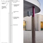 The main reception lobby is differentiated by a raised and canted roofline clad in the same patinated copper that appears elsewhere on the campus. Greenscreen trellis panels are attached to the courtyard walls so that-in time-the walls will be vegetated, furthering the idea of a community green space. Circulation from main reception to the public health clinic is delineated by a curving covered walkway-one of several on site-lined with brightly painted columns encased in perforated metal jackets.