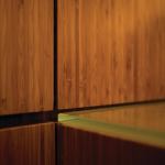 The millwork in the retail space is made from 3/4″-thick panels of Teragren Bamboo plywood. The vertical-grain surface has a caramelized finish that brings warmth to a space otherwise dominated by metal, concrete, and glass. And because the core of each panel is made up of short pieces of bamboo that are stacked perpendicular to the surface’s vertical grain, the bored holes in the front-most panel have a beautifully detailed, exposed cross-section.