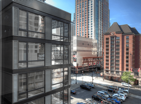 “The rhythm of the deeply recessed full-height windows, which are encased in angled, weathered, metal frames, echoes the cast-iron façade of the nearby Cary Building, an 1857 Italian Renaissance Revival structure. The floor-to-ceiling window walls are positioned to optimize views while maintaining privacy for residents. The protruding panels are angled to provide shading inside the building and, on the outside, changing patterns of light and shadow.”