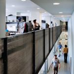 More than 70,000 square feet of laboratories are located above the stone base. A narrow footprint allows daylight to penetrate deep into the 14-story building. Moneo amplifies the light by creating double-height spaces on the laboratory floors; broad eastern exposure illuminates adjacent mezzanines that house faculty offices and semiprivate student workstations. Gathering spaces pop up around the labs in an effort to encourage mingling by students from different disciplines.