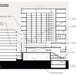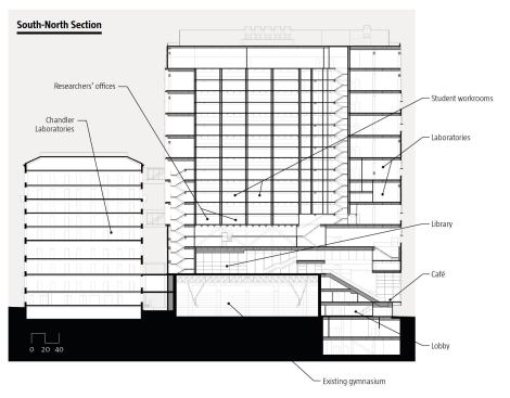 Simply put, the building’s envelope is a giant steel truss from which spaces in the base—including a library, a café, and a lecture hall—are hung. Such a move could have wreaked havoc on the faÇades, but the designers purposefully incorporated the diagonal bracing as an element of the unitized curtainwall’s design (see Toolbox). This honest expression is apparent in the composition of aluminum fins and façade panels. The campus side to the east is mostly glazed, reinforcing the university’s expansive mission, particularly its evolving cross-disciplinary culture in the sciences.
