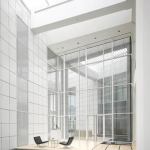 One of the big perks of working with Corian is that individual pieces can be sanded together to form very large seamless units. For Meier, though, the seam is a critical element of his design, since it establishes geometries and parses surfaces into constitutive units. The paneled surface—a signature of his work since 1983, when he completed the High Museum of Art in Atlanta—has become synonymous with his work. “The panels give the space a human scale,” he says.