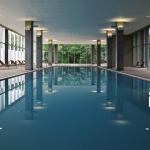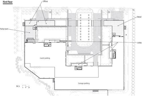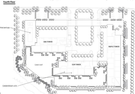 The complex is located on a wedge-shaped property located between an expressway to the east, a forest preserve to the west, and Stanley Tigermanâs new Illinois Holocaust Museum to the south. Hovey sited two double-loaded towers of almost identical length running north-south and a longer, third tower running east-west. The towers sit atop a four-story base, which incorporates an entrance courtyard and amenities such as parking, a swimming pool, and a party room. Units on the lowest residential level have access to the main, 1.2-acre green roof above the parking garage. Other green roofs appear on higher levels, and have access from private terraces.