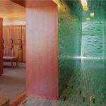On the second floor is the men’s grill; its lounge area offers panoramic views of the surrounding valley through an immense glass curtain wall. Blackwell introduced a media wall, fireplace, and bar to domesticate and subdivide the room. Tucked into the north end of the space is the sumptuous locker room, where cherry-veneer lockers exude the feeling of expensive casework. The adjacent wet area is skinned on all surfaces in shades of green-glazed tile, while a corridor that veers off to one side ends in a double-height, skylit spa.