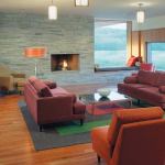 INNER PEACE The clubhouse interiors exhibit a modern sensibility that complements Blackwell’s architecture. In the dining room and elsewhere, interior designer Meredith Boswell combined lean furnishings with muted carpets and upholstery to create a comfortable but subdued setting.
