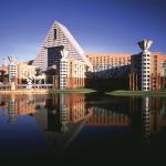 While most of the Disney World hotels simulate actual places either past, far off, or both, these two played on a kind of Pop imagery: forms of toylike geometry and colors, capped by the super-scaled rooftop creatures that lent the hotels their names. These fraternal twins are situated on either side of an artificial lagoon, linked by an axial causeway. Convention wings for each are on their far sides, bordering their respective parking lots.