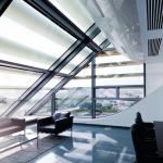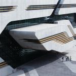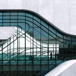The programs inside, and especially the public spaces legible on the exterior, effectively open the institutions to the public. Smooth pre-cast concrete panels enclose volumes that are separated by glazed interstitial spaces that in turn track the path of public spaces through the building. Hadid maps the interior on the exterior, and even projects the vertical map of the façade horizontally onto the front plaza and back parking spaces as a “shadow” in plan.