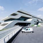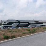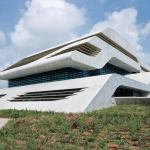 Citizens driving northeast toward the community of La Paillade now round a hill and confront a building by Zaha Hadid, Hon. FAIA, that commands the broad valley from its position on a rise. With flowing lines, rounded corners, and an overall vectorial list to the west, the monumental structure seems like a moored ship. In the landscape, Hadid’s design is a completely unexpected apparition.