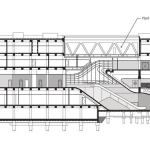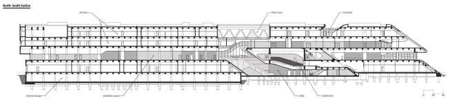 In addition to the agenda of creating an environment that forms individuals—Vezinhet cites, in Latin, the Roman poet Juvenal’s admonition for a sound mind in a sound body—there was the social agenda. The council president made a gesture to a disadvantaged minority neighborhood with a program of social outreach housed in a building that makes a grand and serious architectural gesture. The building has the presence of a cathedral, and will organize the town now being built around it. Vezinhet conceived and sited Pierresvives as a commanding player on an urban chessboard. The building will serve as the centerpiece in a new eco-city of about 900 apartments, that will link to La Paillade, an existing neighborhood with some 25,000 people—including a large Maghrebian population living in public housing.