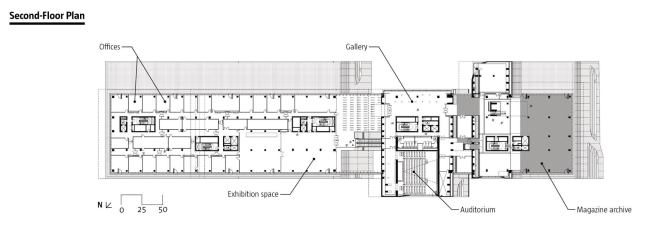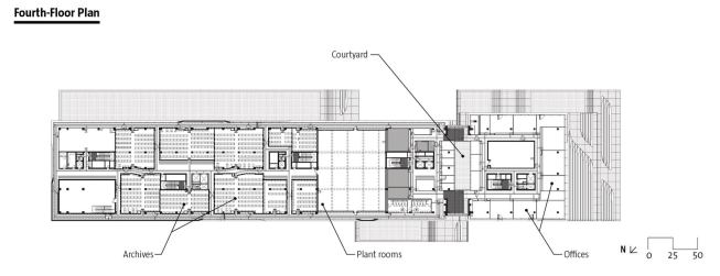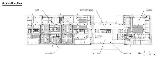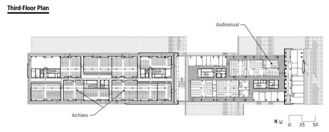 Hadid frequently bases her projects in organizational diagrams. At Pierresvives, working with project architect Stephane Hof, she based the plans in a concept of branching. The organizational concept quickly adopted a metaphor—the tree of knowledge—worked out not only in plan but also in section and on the façade, where glazing outlines corridors and public spaces that branch through the building. In between, opaque concrete volumes house archives constituting a full 60 percent of the building. The flow of spaces represents not only the trunk and branches but also the flow of sap.