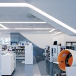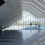 Hadid does not design down to her audience, and in Montpellier the client himself set the bar high. The driving spirit behind the project, which is called Pierresvives, was Dr. André Vezinhet—president of the province’s General Council and a former chief city planner—who cites the humanist agenda of Rabelais: “I build only living stones [pierres vives]—men.” The idea is to build people, in this case through architecture that houses an enriching mix of cultural and athletic programs. The building, dubbed “City of knowledge and sports,” unites and relates three departments—regional archives, sports headquarters, and a multimedia library—all under one long roof that is several football fields in length. The separate agencies had all outgrown their respective facilities, and Hadid won the competition in 2002 by proposing to bring them together in a single building, rather than leaving each one isolated on different parts of the same campus.