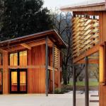 The comfortably scaled interiors reveal other eco-friendly gestures. Flooring in the community hall’s large meeting room, for example, was milled from local eucalyptus trees. Alder trees cut down to make way for the new ball field now wrap distinctive columns inside the buildings. And high-slag concrete—used in foundations, floor slabs, and library alcoves—lowered the project’s carbon footprint by 125 tons.