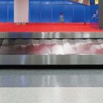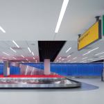 The floors in the screening area feature soft rubber flooring, typically found on playgrounds and in athletic facilities. “We determined that this surface was more comfortable than cold, hard terrazzo for standing without shoes,” says Hooper. “We also wanted to reduce the stress of having to hurriedly gather your belongings as they come off the conveyor, so we designed a 225-foot-long bench for ‘revesting’ before continuing to the gate or marketplace area.”